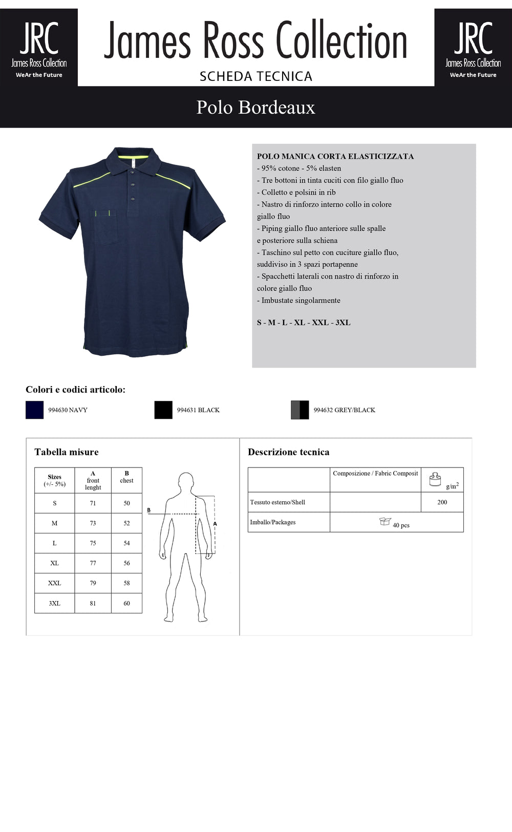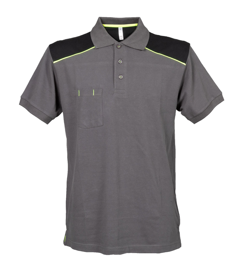POLO A MANICA CORTA ELASTICIZZATA - 95% cotone - 5% elasten. Tre bottoni in tinta cuciti con filo giallo fluo, colletto e polsini in rib, nastro di rinforzo interno collo in colore giallo fluo, piping giallo fluo anteriore sulle spalle e posteriore sulla schiena. Taschino sul petto con cuciture giallo fluo, suddiviso in 3 spazi portapenne, spacchetti laterali con nastro di rinforzo in colore giallo fluo - Imbustate singolarmente.