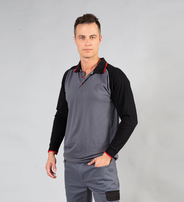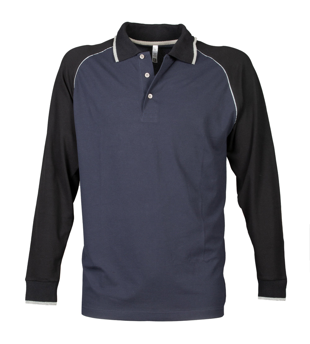 Polo manica lunga elasticizzata - 95% cotone - 5% elasten. Tre bottoni in contrasto, maniche raglan con piping rifrangente anteriore e posteriore, colletto e polsini in rib con piping, nastro di rinforzo interno collo in contrasto, spacchetti laterali con nastro di rinforzo in contrasto.