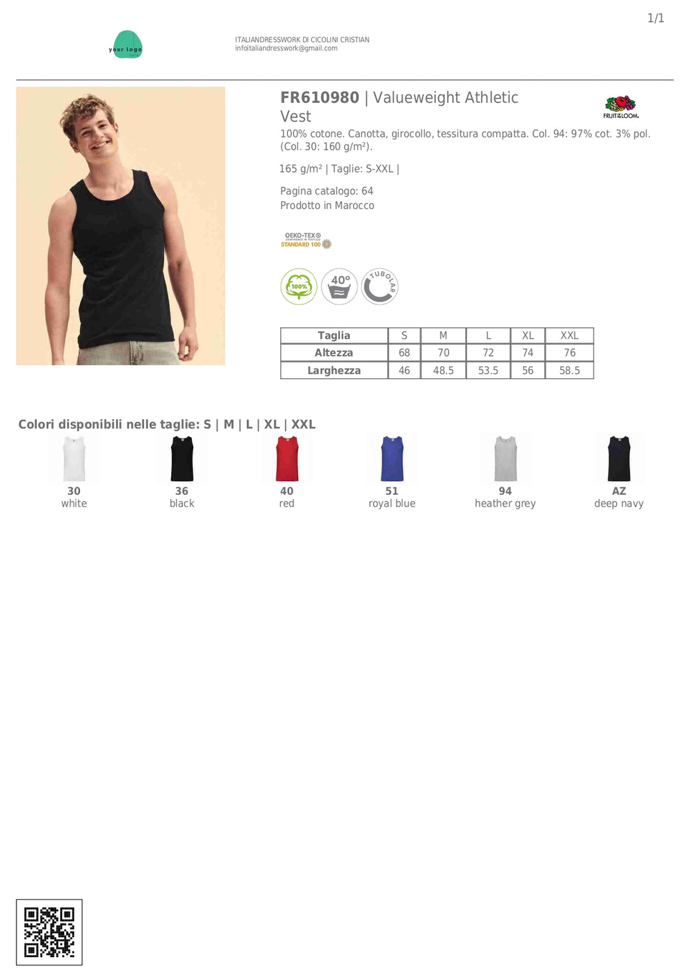 CANOTTA ATHLETIC VEST FR610980 FRUIT OF THE LOOM UOMO