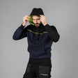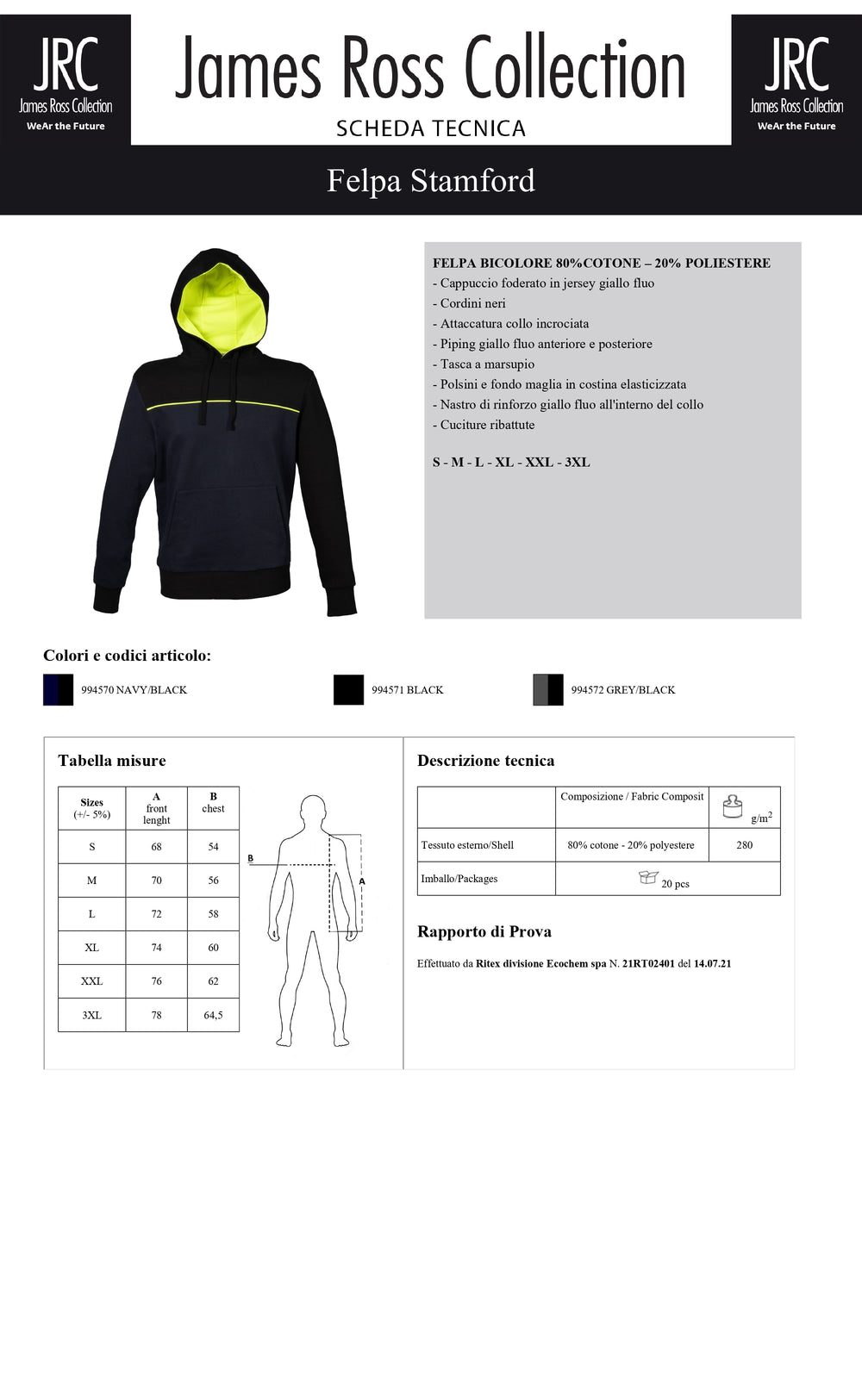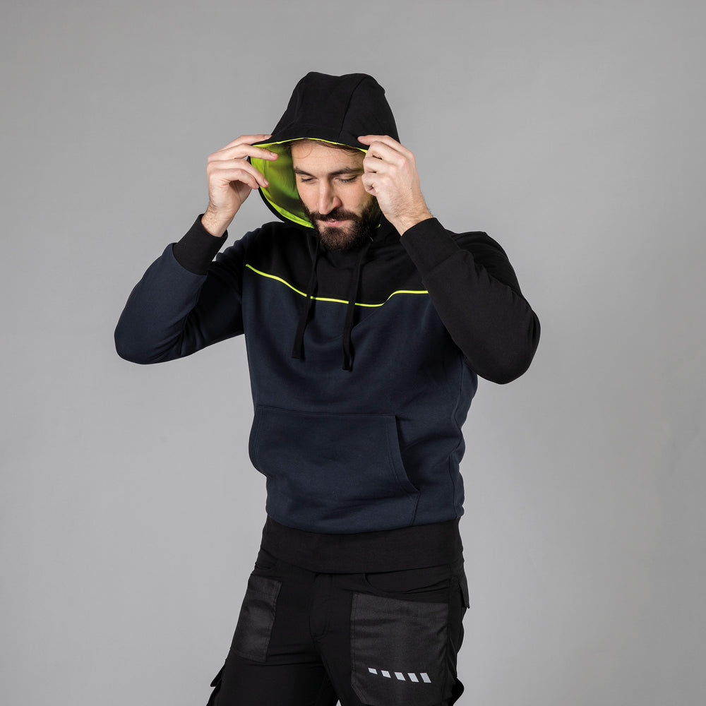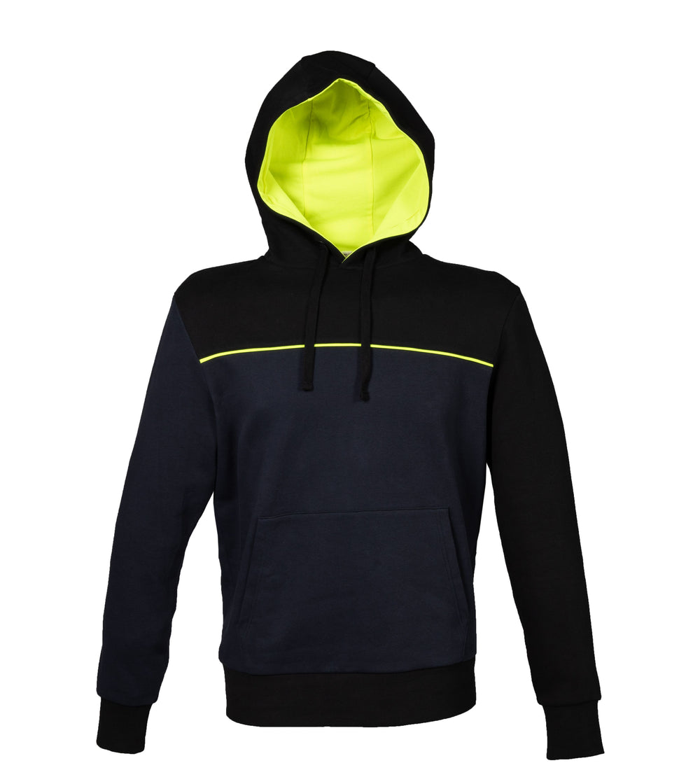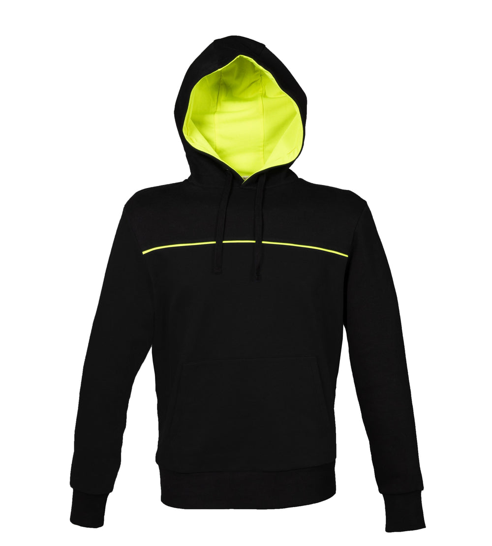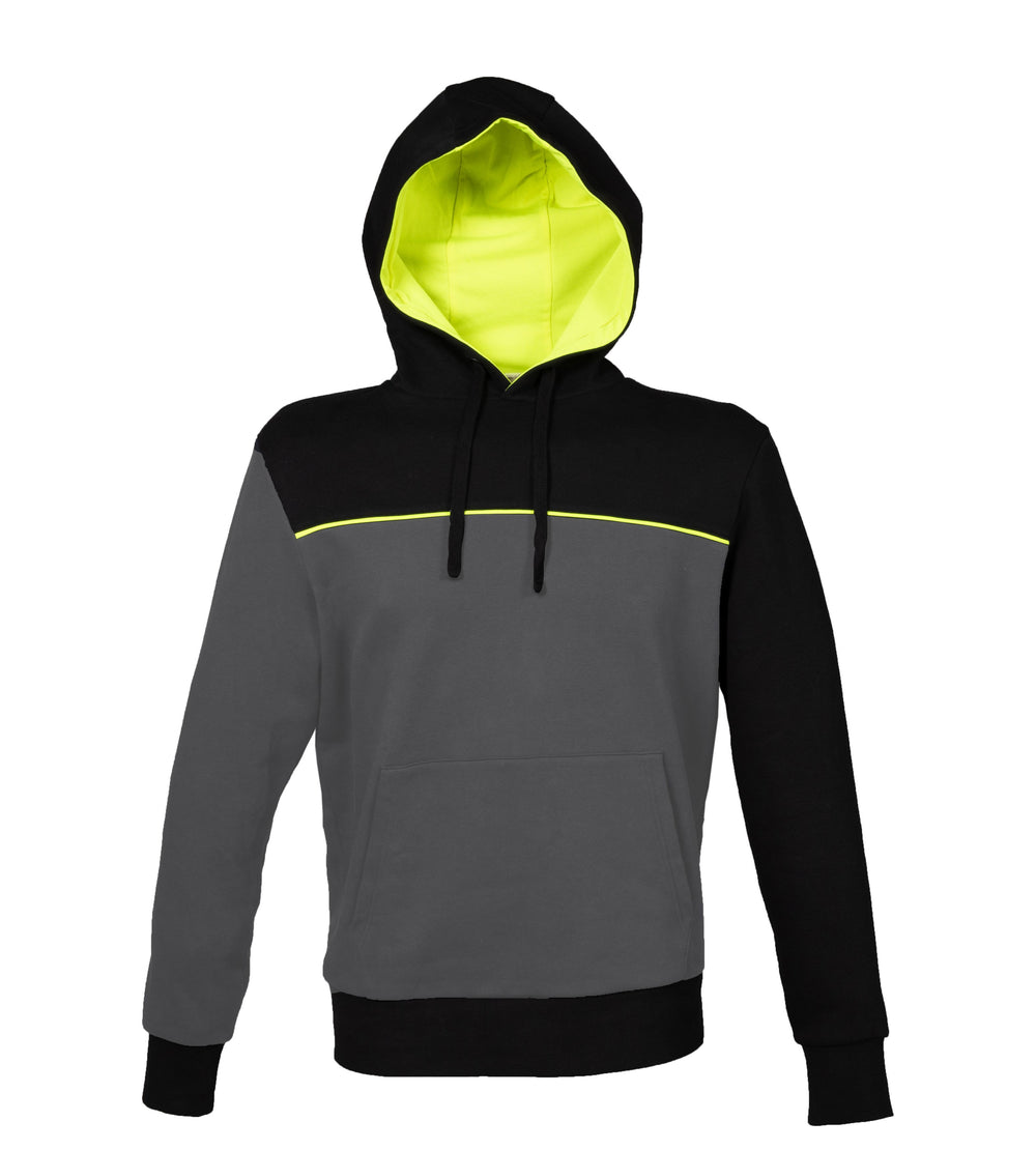 FELPA BICOLORE 80%COTONE – 20% POLIESTERE. Cappuccio foderato in jersey giallo fluo, cordini neri, attaccatura collo incrociata, piping giallo fluo anteriore e posteriore, tasca a marsupio. Polsini e fondo maglia in costina elasticizzata, nastro di rinforzo giallo fluo all'interno del collo, cuciture ribattute.