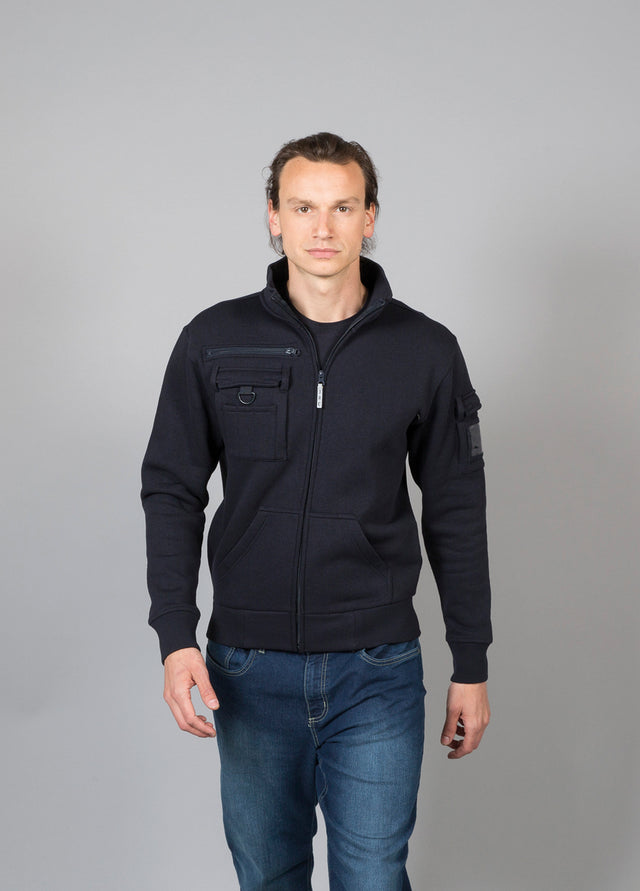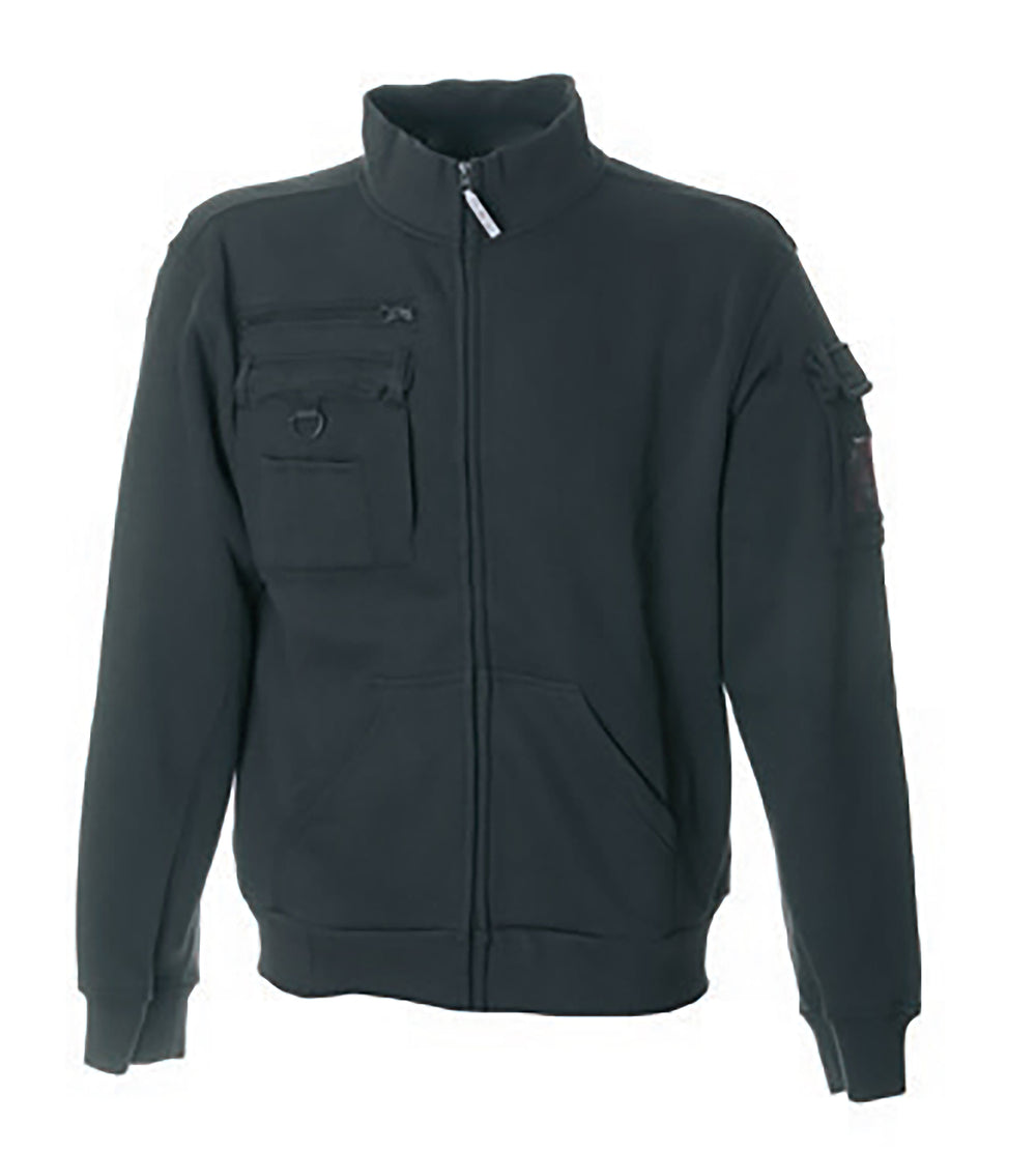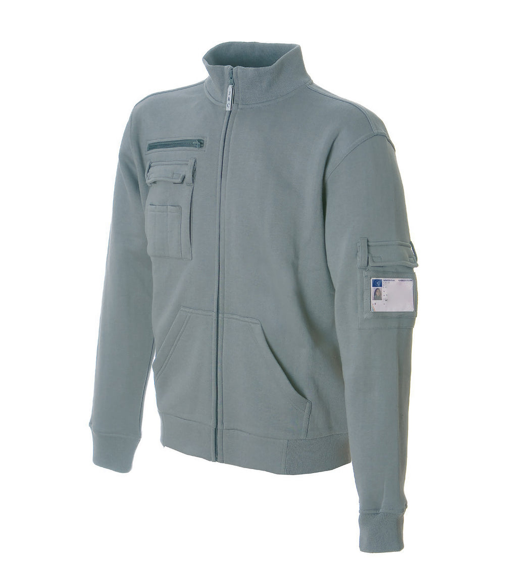 Felpa 65% poliestere - 35% cotone. Collo a lupetto, zip lunga coperta, una tasca con zip sul petto, una tasca sul petto con velcro, triplo portapenna e gancio portachiavi estraibile, una tasca sul braccio con portabadge e tasca a marsupio. Collo, polsini e fondo maglia in costina elasticizzata, nastro di rinforzo interno collo e cuciture ribattute.