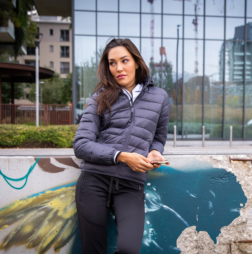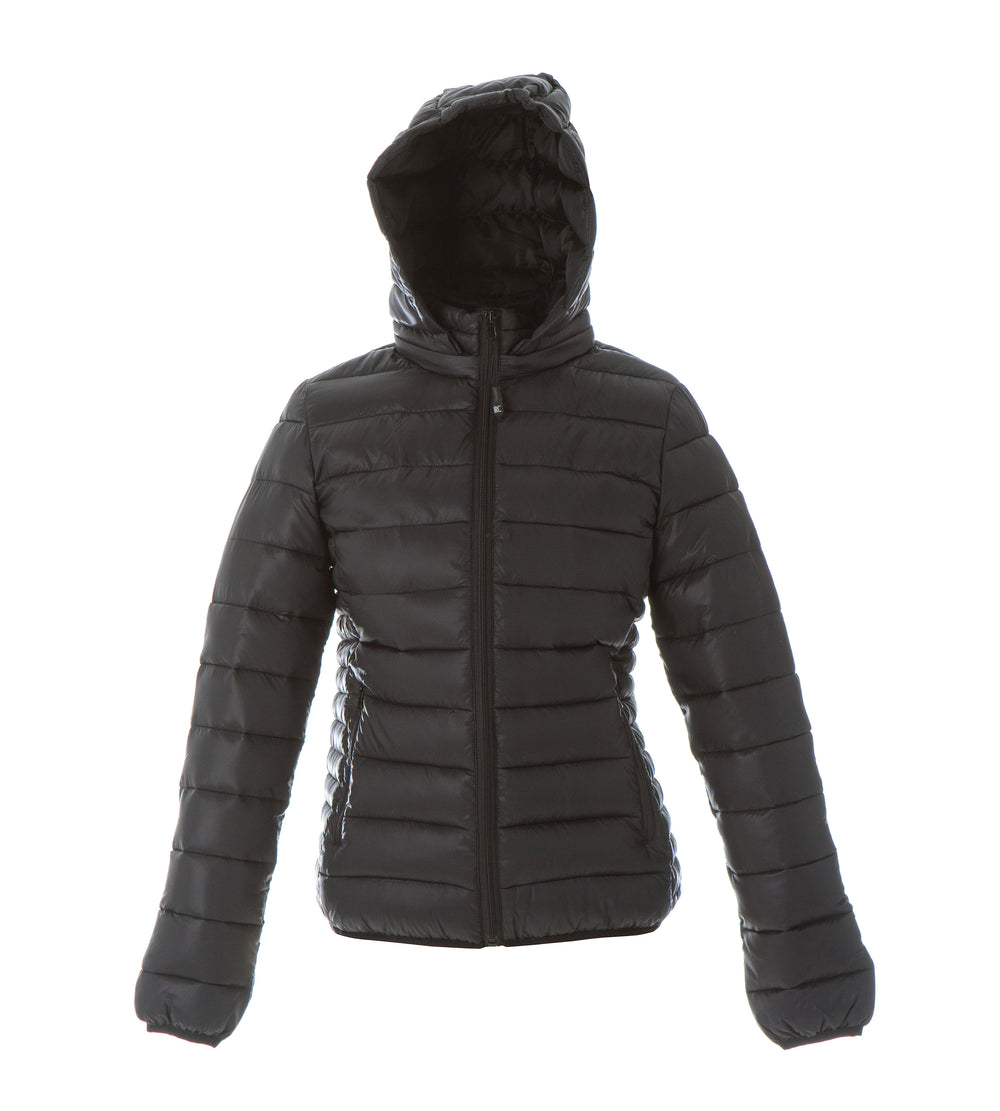 Giubbino donna in nylon 20D morbido, lucido, impermeabile e imbottito - Fodera morbida in polyester 300T - Imbottitura in soffice poliestere (effetto piuma). Cappuccio imbottito staccabile mediante zip coperta, due tasche con zip e una tasca interna portafoglio, tessuto elastico nel fondo e ai polsini.