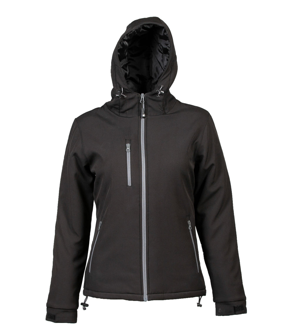 Giubbino donna in soft shell a due strati impermeabile e traspirante - 96% polyestere - 4% elastane - Impermeabilità 6000 mm/HO. Fodera in polyestere con cuciture verticali, imbottitura in polyestere, cappuccio imbottito con coulisse, cerniere nastrate YKK, una tasca sul petto con zip, due tasche esterne con zip, una tasca interna portafoglio con velcro, polsini regolabili con velcro e coulisse al fondo.