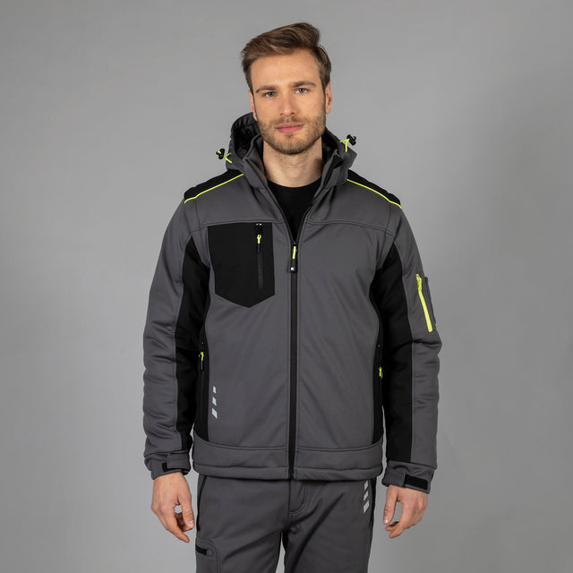 Giubbino in soft shell a 3 strati impermeabile e imbottito - 96% poliestere - 4% elastane - Impermeabilità 8000 mm/H2O - Traspirabilità 1000 g/M2/24h. Fodera in poliestere con cuciture verticali, no label, imbottitura in poliestere, stampa rifrangente anteriore, stampa rifrangente postierore sul fianco, piping giallo fluo anteriore sulle spalle e posteriore sulla schiena, maniche staccabili mediante zip coperta, cerniere nastrate. Cappuccio imbottito con coulisse staccabile mediante zip coperta, una tasca sul petto con zip, due tasche esterne con zip, una tasca con zip sul braccio e doppio portapenne e una tasca interna portafoglio con velcro, tessuto a protezione del mento con logo 4STRETCH, polsini elastici regolabili con velcro e coulisse al fondo