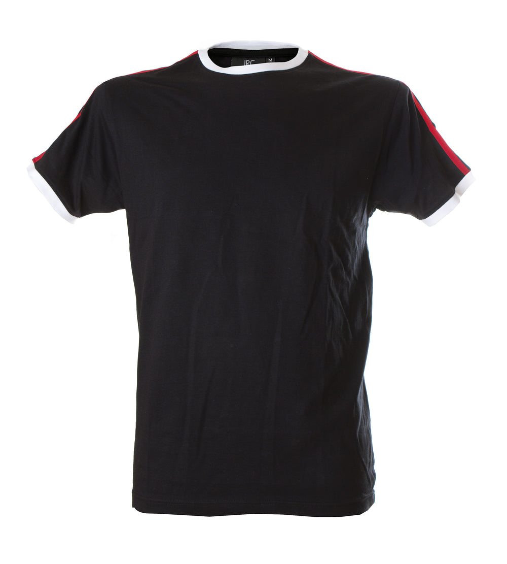 T-shirt a manica corta girocollo - 100% cotone. Colletto e fondo manica in contrasto, tre strisce in tessuto tricolore sulle spalle - Imbustate singolarmente - Vendibili singolarmente