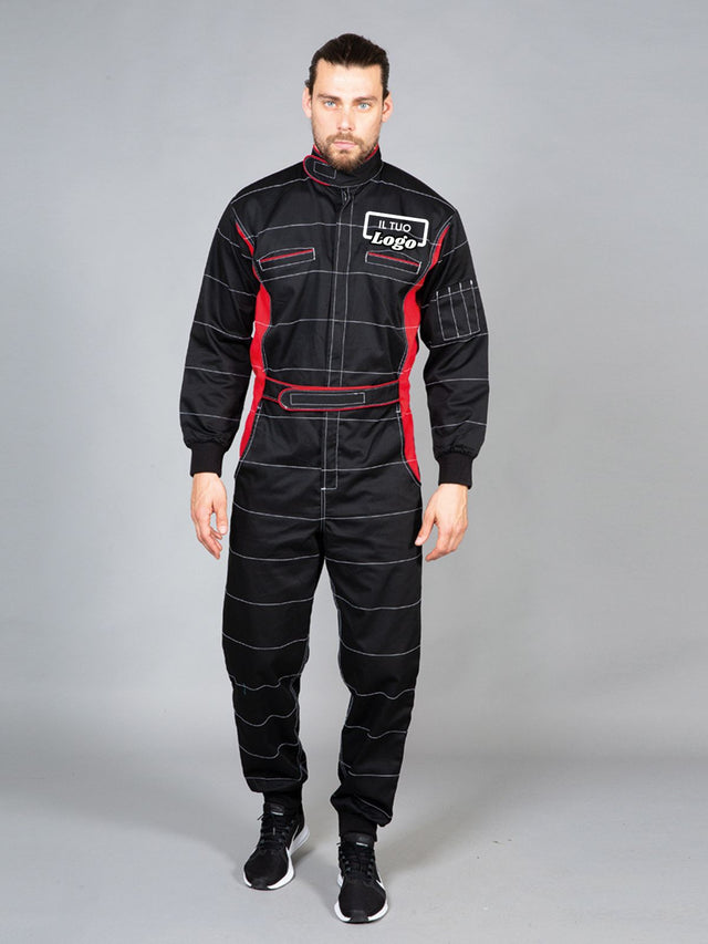La tuta è dotata di due tasche sul petto, due tasche frontali aperte, un triplo taschino portapenne sul braccio e tessuto in maglia ai polsi e al fondo gamba per una maggiore aderenza e praticità.